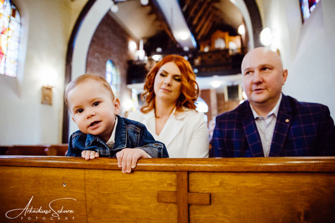 Leon bardzo ciekawy, chętnie pozuje do aparatu. Ksiądz zaczyna od tzw. egzorcyzmu, potem rodzice i chrzestni robią znak krzyża na głowie Leona. Zostaje polewanie głowy dziecka wodą święconą, nakładanie białej szatki przez chrzestną i zapalanie świecy przez chrzestnego. Na koniec namaszczenie główki. Tak wyglądają zdjęcia z chrztu świętego. W między czasie mamy zdjęcie Jakuba, chrzestnych i grupowe rodzinnie przed kościołem oraz z księdzem przy ołtarzu. Mimo pandemii było miło, spokojnie, a Leon wytrzymał całą mszę.