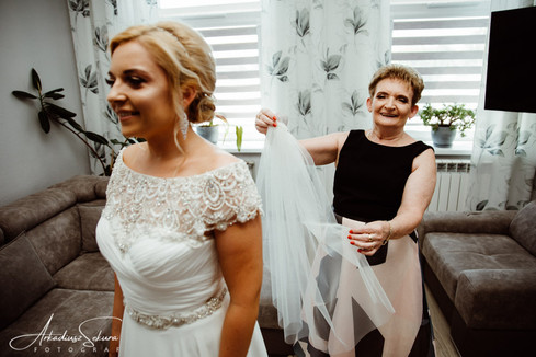Świadkowa i rodzina pomagają ubierać Panią Młodą Magdę. Niby wszystko takie proste, ale ile radości przy tym, że szkoda było by pominąć takie ujęcia. Suknia zapięta, buty założone, czas na podwiązkę i biżuterię. Welon przypięty. Zostaje wypatrywanie Pana Młodego.. TikTak.. nie ma go i nie ma go.. Hehe jest. Sąsiedzi nie dadzą wejść bez wkupnego. Nie ma tak łatwo drogi Piotrze. Udało się. Łzy radości się pojawiły u Magdy. Ależ piękne emocje. Zostaje błogosławieństwo i lecimy na ślub.