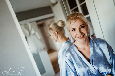 Przed założeniem sukni ślubnej, udało się jeszcze zrobić zdjęcie Karolinie w szlafroku. Fajne i na luzie. Po chwili suknia założona i możemy kontynuować zdjęcia. Przy biżuterii ślubnej pomaga świadkowa, a z butami mama. Na koniec kilka zdjęć grupowych i jedziemy do Urzędu Stanu Cywilnego.