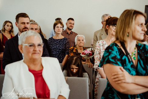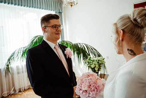 Karolina i Kuba już w USC. Oboje przyrzekli sobie wierność, miłość i takie tam... ale żeby nie było, to akt małżeństwa lepiej przeczytać cały. Ślub przebiegł w bardzo radosnej atmosferze. Dzieci uczestniczyły przy zakładaniu obrączek. Było naprawdę uroczo. Po ślubie jeszcze kilka zdjęć przy składaniu życzeń i jedziemy na "wesele".