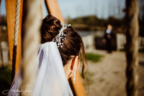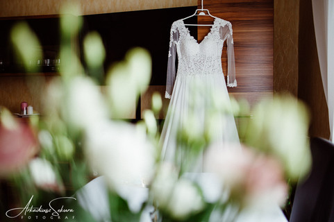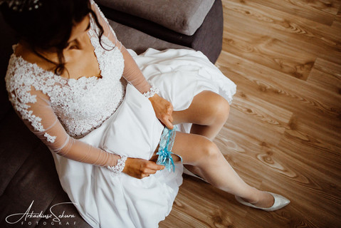 Odwieczne pytanie jak ustawić suknię by prezentowała się idealnie.. Nie ma takiego przepisu, trzeba improwizować, zaufać "światłu". Dzięki temu każde przygotowania sią takie ciekawe. Są inne domy, mieszkania, światła i wystrój. Koniec opowieści, bo Ola już w sukni. Teraz biżuteria, podwiązka i welon. W tym samym czasie przyjeżdża Przemek. Zaczynamy błogosławieństwo, zdjęcie grupowe i jedziemy na ślub.