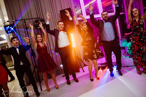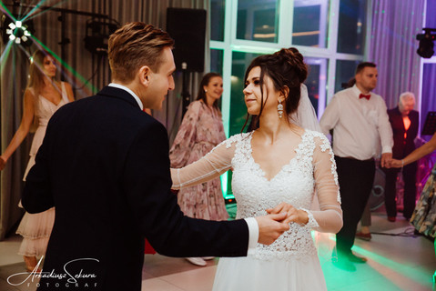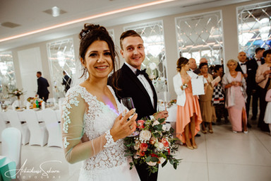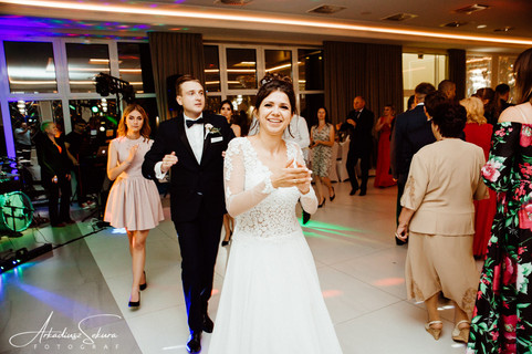 Młoda Para przywitana przez rodziców chlebem, solą i wódeczką. Miła tradycja zachowana. Życzeń ciąg dalszy. Czas na ciepły posiłek, gorzką wódkę i pierwszy taniec. Parkiet otwarty, teraz zostaje tylko bawić się do samego rana. Tańce, przytulańce, wężyki, kółka. Każdy bawi się jak lubi. Mamy również smaczne przystawki na stole wiejskim i tort. Były podziekowania dla rodziców i świadków. Całość zamykają oczepiny.