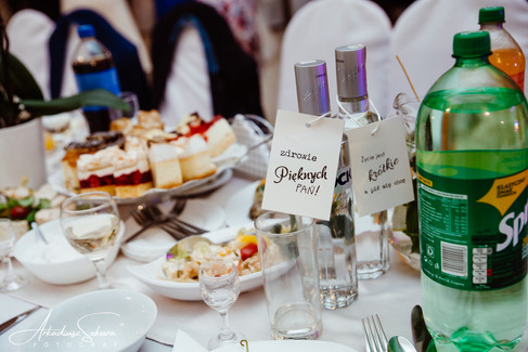 Dotarłem na sale. Jest jeszcze kilka chwil na zdjęcia detali, stołu i tego jak to pięknie wygląda już na samym początku. Rodzina, znajomi i Państwo Młodzi już są. Witamy Was chlebem, solą i wódką. Szampan dla gości, życzenia dla Was piękni i młodzi. Po ciepłym posiłku zaczynamy pierwszy taniec i bawimy się do rana.