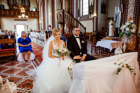 Goście dotarli na ślub, ksiądz jest, zaczynamy. Zdjęcia ślubne w kościele już troszkę bardziej "poważne". Spacer do ołtarza, kazanie i zaślubiny. Usłyszeliśmy 2xTAK. Uśmiech na twarzach się pojawił. Obrączki założone. Całą mszę towarzyszyło nam światło wpadające przez kolorowe witraże wprost na zakochanych. Tak jak by chciało dodatkowo coś powiedzieć. Na pewno były by to same dobre słowa.