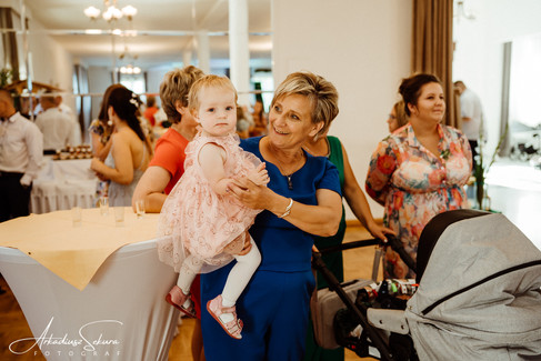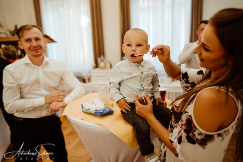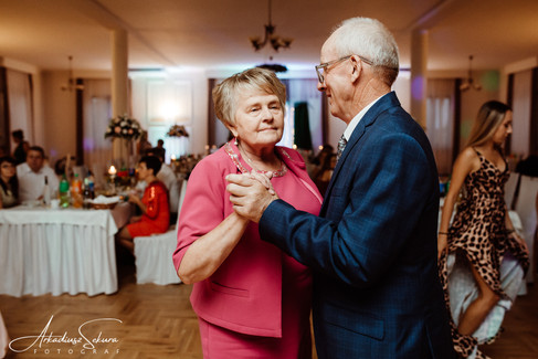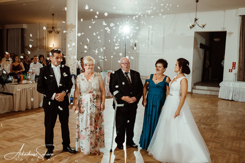 Tradycyjnie witamy chlebem i solą Państwa Młodych. Szampan dla gości, 100 lat dla zakochanych. Czas na ciepły posiłek, "gorzką wódkę" i pierwszy taniec. Parkiet "legalnie otwarty". Goście bawią się na całego, muzykanci pięknie grają. Stół wiejski i ze słodkościami cieszy się dużym zainteresowaniem.